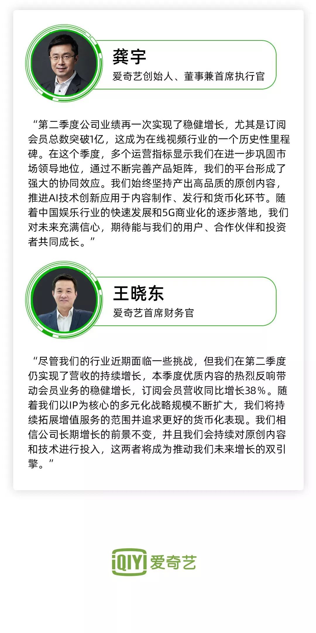 爱奇艺创始人、董事兼首席执行官龚宇博士表示:“第二季度公司业绩再一次实现了稳健增长,尤其是订阅会员总数突破1亿,这成为在线视频行业的一个历史性里程碑。在这个季度,多个运营指标显示我们在进一步巩固市场领导地位,通过不断完善产品矩阵,我们的平台形成了强大的协同效应。我们始终坚持产出高品质的原创内容,推进AI技术创新应用于内容制作、发行和货币化环节。随着中国娱乐行业的快速发展和5G商业化的逐步落地,我们对未来充满信心,期待能与我们的用户、合作伙伴和投资者共同成长。”