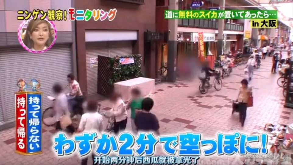 除此以外,更多是对素人民众的行为观察,不同场景环境中,对人类真实反应和内心想法的直接捕捉,假如大阪和京都两地商业街的西瓜突然免费,顾客们的反应有何不同?京都的15个西瓜20分钟后才被全部拿光,大阪仅2分钟便被抢光,像社会学、心理学实验一般为观众完美呈现了大阪与京都人民的「刻板印象」都是真的。