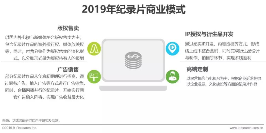 中国纪录片商业模式盈利模式多样,广告销售仍是主要收入来源总体来看,近些年的市场化运作使得相当一部分观众能够接受付费观看,社会资本的介入一定程度上拓宽了纪录片的商业空间,为纪录片生产提供了必要的资金支持,纪录片盈利模式得以呈现多元化发展,主要以广告销售、版权售卖、IP授权及衍生品开发等为主,但广告销售仍为主要收入来源,收入占比一般超过50%。同时,电视台因其资历与经验丰厚,为企业进行高端定制纪录片也成为其一大盈利来源。相比于其他类型作品,纪录片商业化能力较弱,一定程度上限制了纪录片产业化、市场化进程。随着互联网与纪录片融合程度不断加深,丰富纪录片盈利模式,开拓多元化收入渠道,具备更多的想象和创新空间。